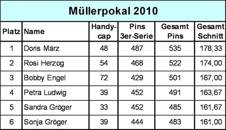 Der Müllerpokal wurde seit 1989 einmal jährlich ausgespielt. Das letzte Mal im Jahr 2010. Er wurde in einem Start über drei Spiele im Handy- capmodus ausgespielt. Das Handycap war ein Drittel der Differenz des aktuellen Trainingschnittes zu 200 (z. B. bei 170 = 10 Pins). Den Namen verdankt er dem Stifter dieses Pokals, dem Vorstand des Hauptvereins Klaus Müller. Nachfolgend die letzten drei Auspielungen des Pokals.